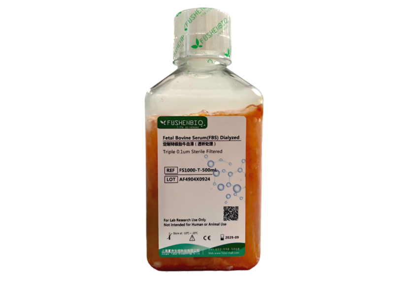 透析胎牛血清是在胎牛血清的基礎(chǔ)上進(jìn)行加工的。在4°C下用特定的透析膜對(duì)血清在0.15M NaCl中透析。由于該透析膜只允許10 kDa以下的小分子穿過(guò),在滲透壓的作用下,這些小分子便從血清中滲析到透析膜外的NaCl溶液中。10 kDa以下的小分子有化學(xué)小分子、核苷酸、某些激素、鹽、低分子量蛋白質(zhì)、氨基酸、細(xì)胞因子、葡萄糖、殘留抗生素和其他外源分子。