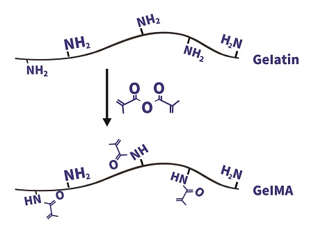 明膠(Gelatin)是經膠原蛋白適度水解和熱變性得到的天然生物高分子材料,其具有和膠原相似的氨基酸序列。明膠側鏈上含有多種活性基團,如氨基、羧基、羥基等,多位點化學修飾的可能性使明膠受到眾多水凝膠研究者的青睞。